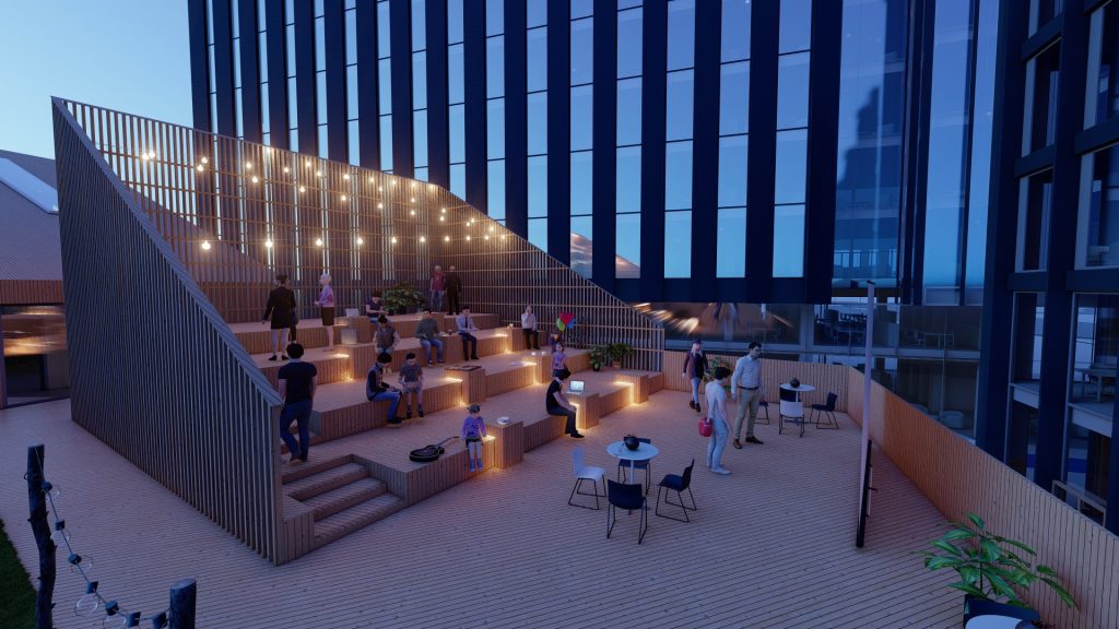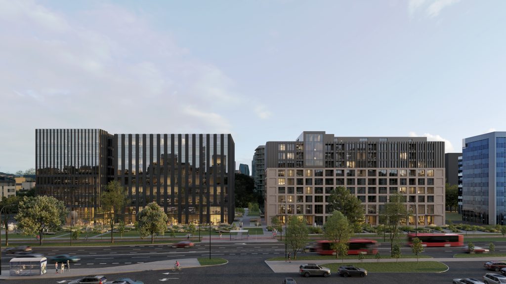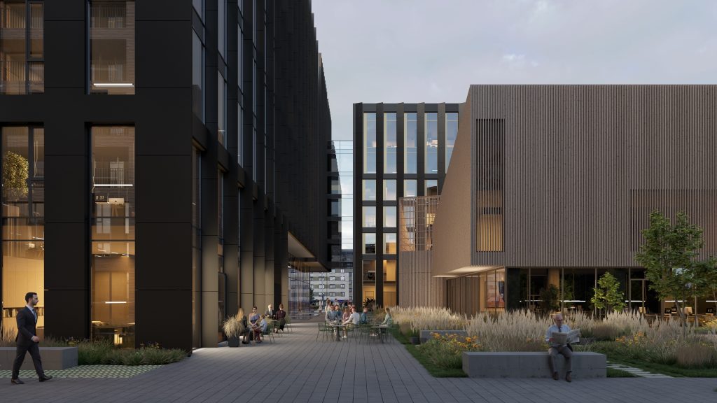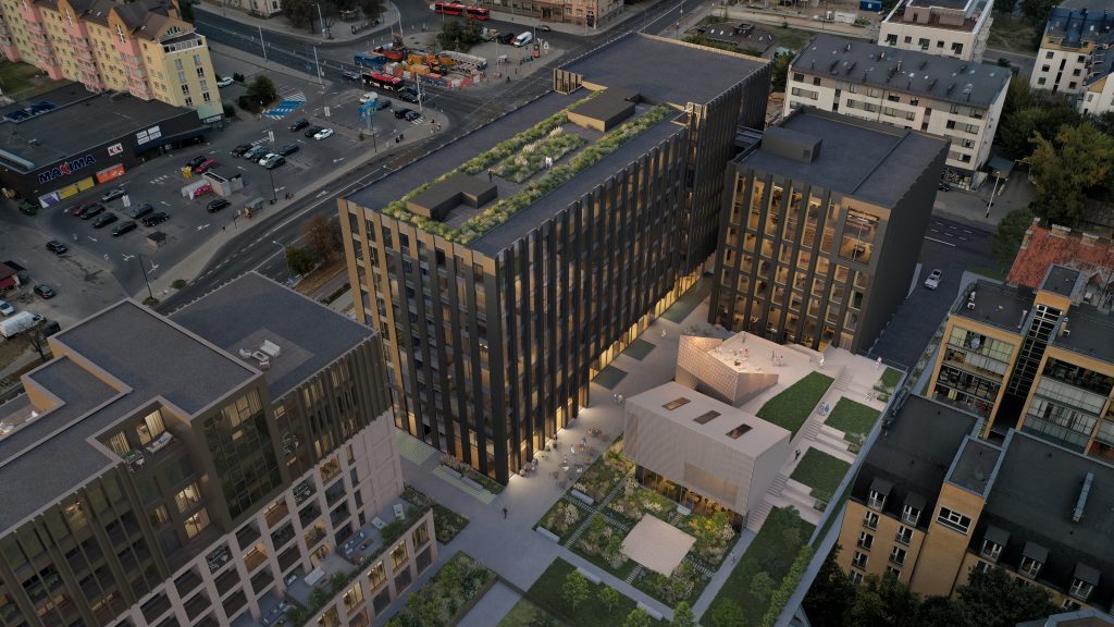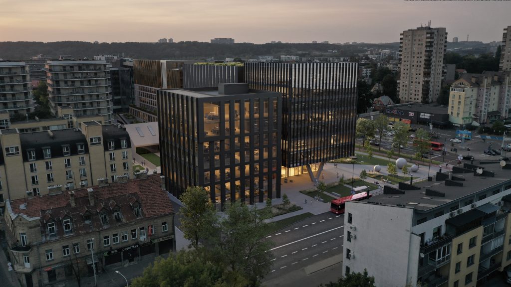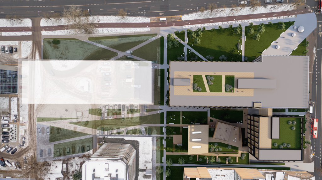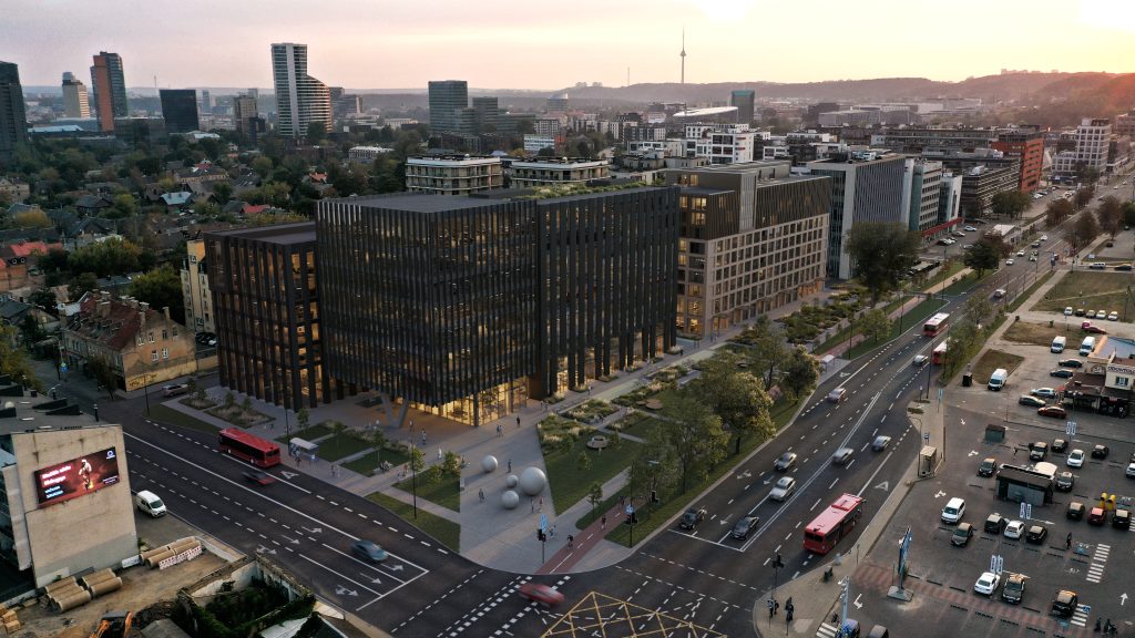 Projekto idėją įkvėpė sklypo vieta ir urbanistinis kontekstas. Sprendiniais siekiama pabrėžti gatvių sankryžos kampo išskirtinumą bei sukurti jaukią zoną, atsitraukiant nuo miesto šurmulio. Atsižvelgiant į aplinkos kontekstą, pastatas projektuojamas trijų korpusų, kurie atspindi Šnipiškių rajono įvairovę. Pirmame korpuse palei Žalgirio gatvę išryškinamas „stiklinis” kampas, pirmojo aukšto atvira erdvė pritaikyta parduotuvėms, o viršuje numatomi biurai. Antras korpusas, kaip atsvara, projektuotas ramiam tūriui prie Kalvarijų gatvės, sujungtas su pirmuoju galerijomis ir sukuriantis vidinį kiemą su poilsio zonomis. Trečias korpusas, esantis kiemo centre, simbolizuoja Šnipiškių medinę architektūrą, tarnauja kaip nekonvencinė ofisų vieta ir bendruomenės susitikimo erdvė. Visi korpusai susitinka vidiniame kieme, kuris skirtas miesto gyventojų ir darbuotojų atokvėpiui bei kūrybiniams susitikimams.