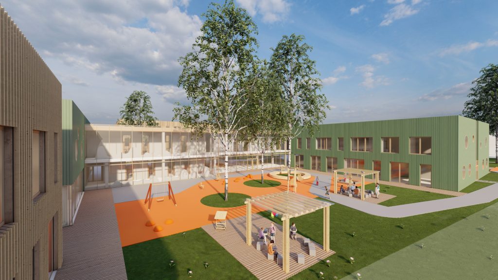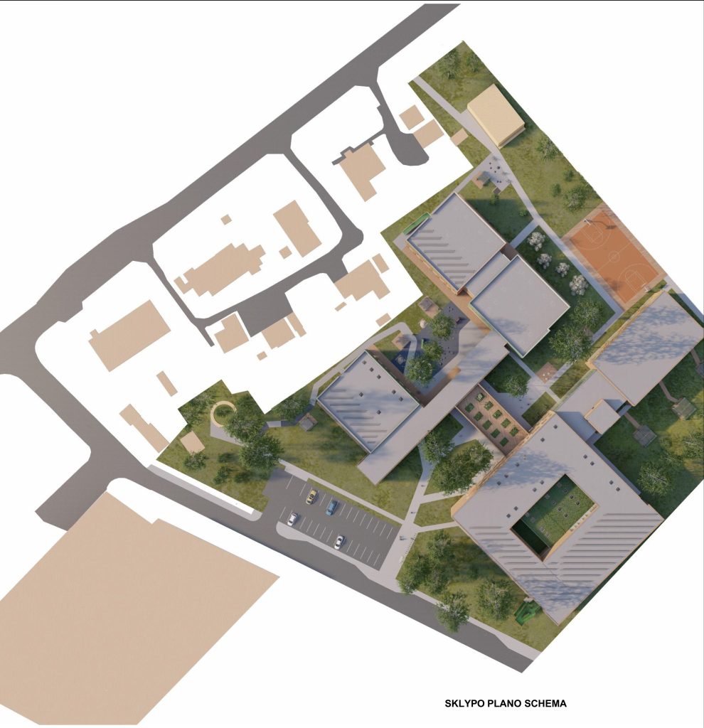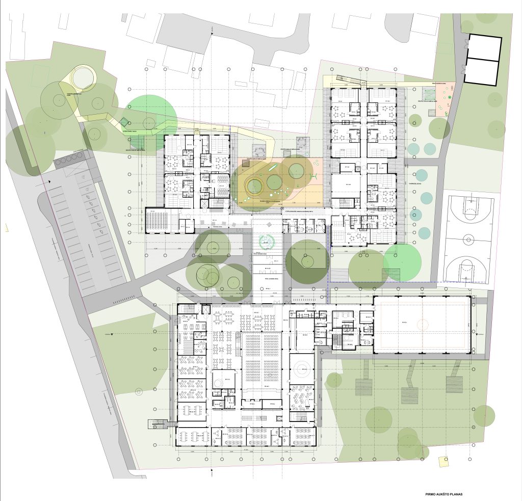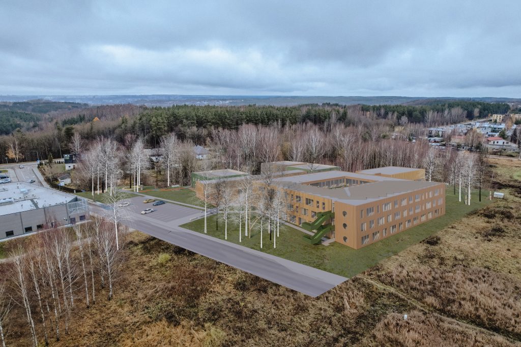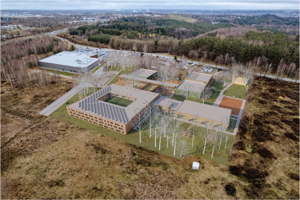 Mokyklos tūris yra kompaktiškas, centrinėje dalyje numatoma pagrindinė erdvė, skirta poilsiui, žaidimams, edukacijai, renginiams ir valgyklai. Mokymosi klasės projektuojamos aplink šią erdvę, taip kuriant patogų vaikų srautų pasiskirstymą ir judėjimą. Taip pat numatomos papildomos poilsio ir žaidimų zonos, kurios atliepia skirtingus vaikų poreikius, skatina bendradarbiavimo ir kūrybiškumo jausmą. Darželis susideda iš kelių smulkių tūrių, sujungtų galerijomis. Tokia struktūra leidžia kurti jaukias erdves tiek pastate, tiek lauke prie žaidimų aikštelių, išsaugant esamus medžius. Galerijos skirtos bendrosioms erdvėms, renginiams, edukacijai, vaikų darbelių ekspozicijoms ir žaidimams. Grupių kambariai orientuoti į lauko edukacines zonas: vabzdžių pažinimo erdvę, vaismedžių sodelį su muzikos instrumentais ir žaidimų aikšteles. Tai kuria harmoningą aplinką, skatinančią vaikų smalsumą, kūrybiškumą ir meilę gamtai.