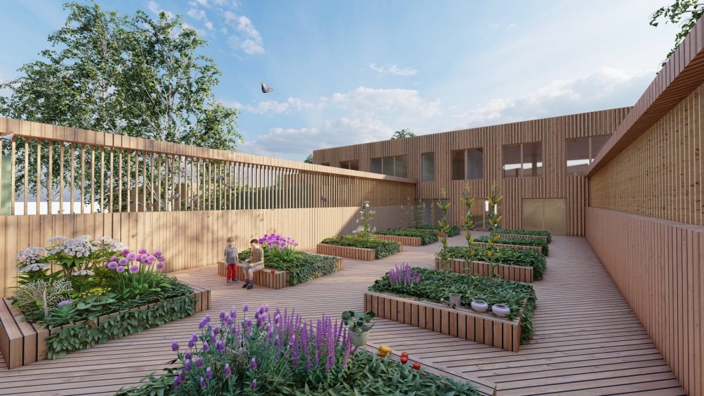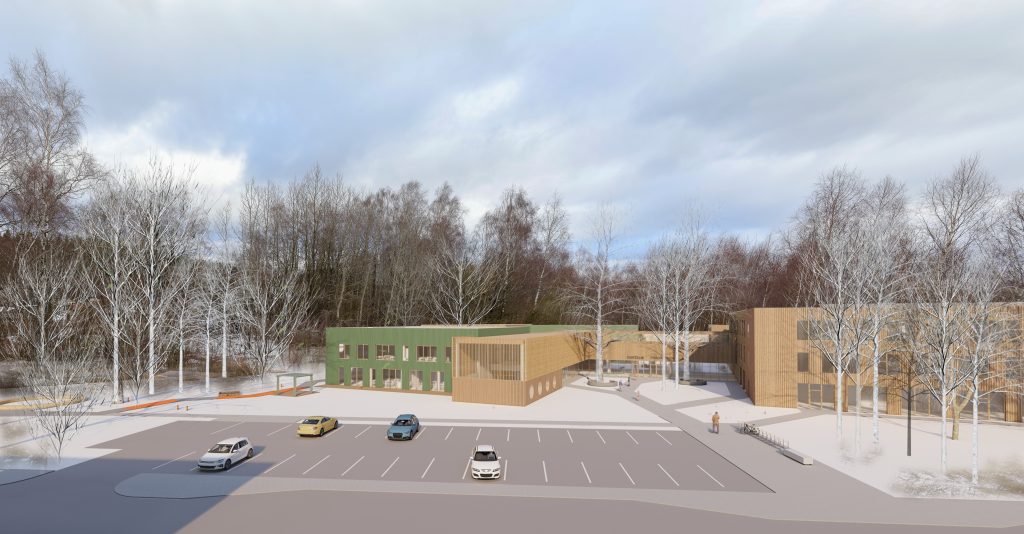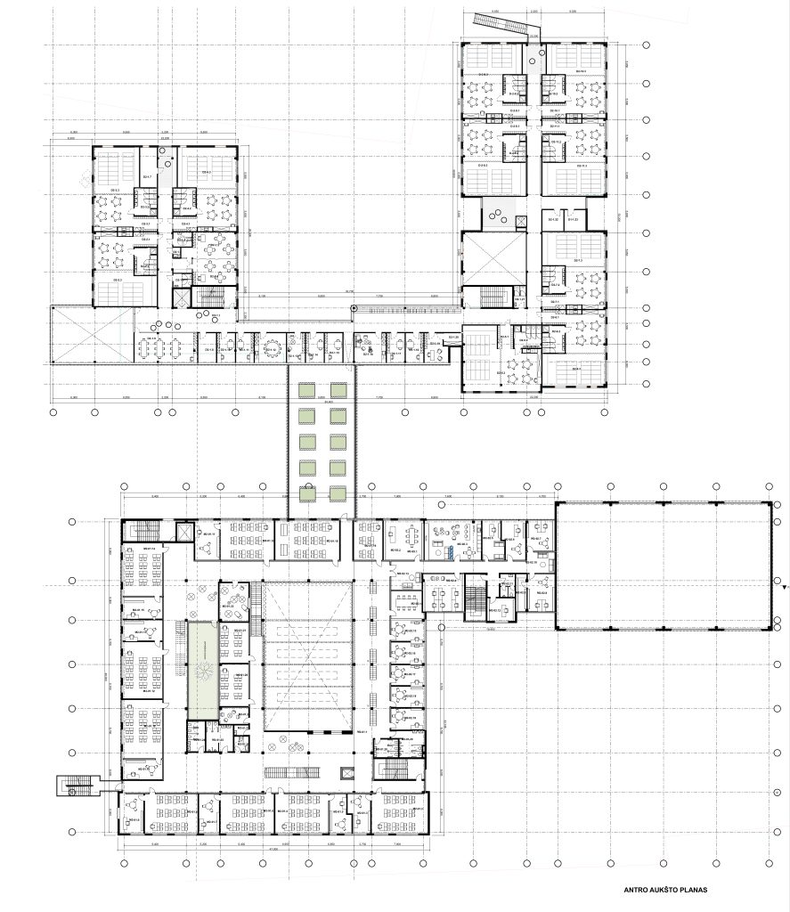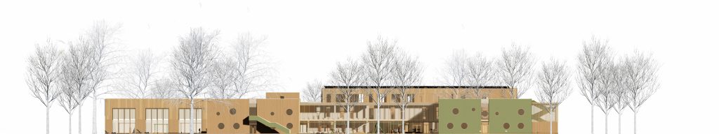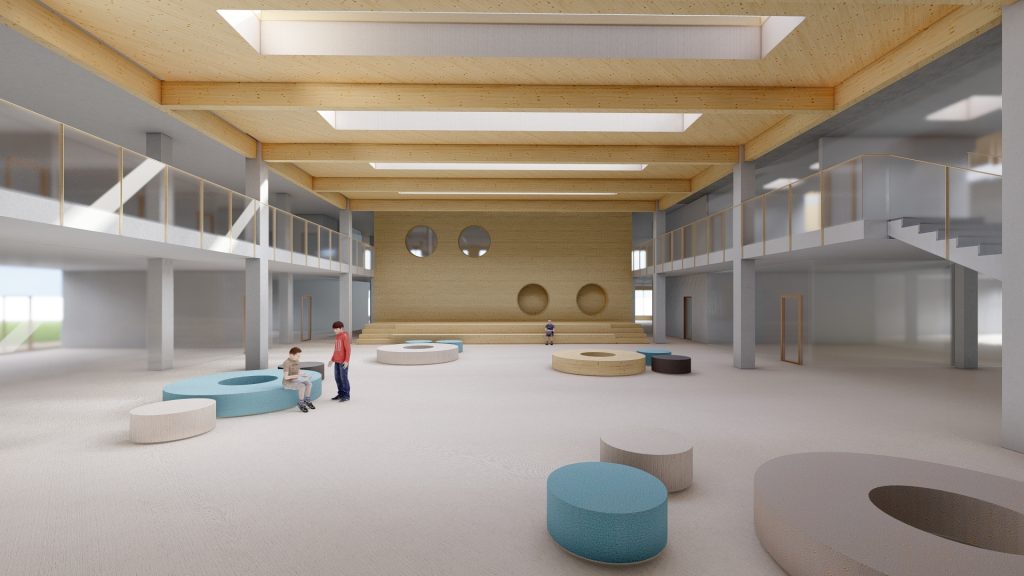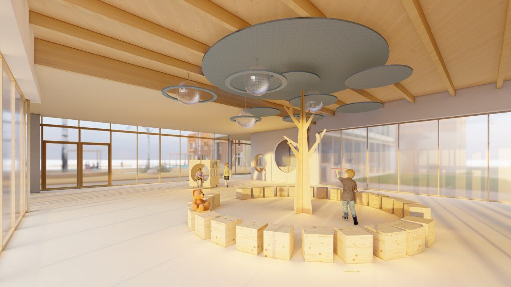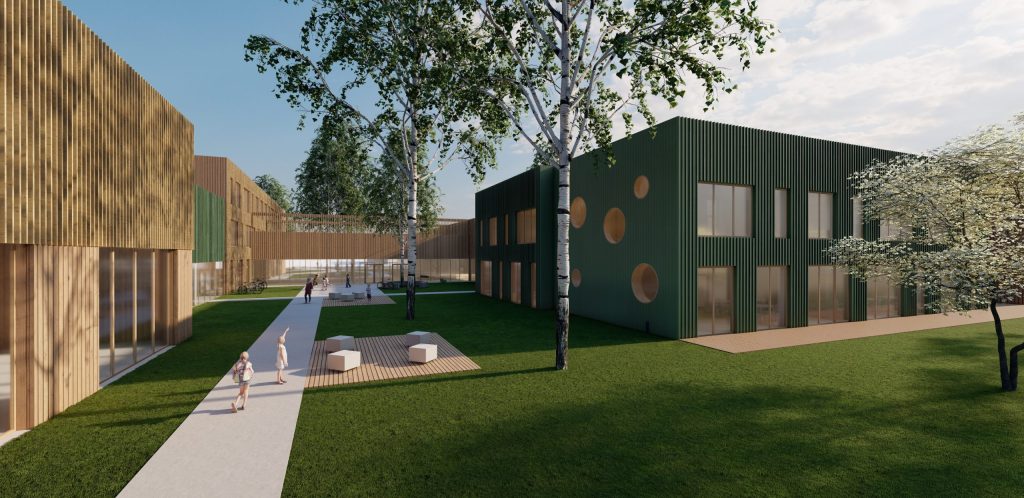 Mokyklos tūris yra kompaktiškas, centrinėje dalyje numatoma pagrindinė erdvė, skirta poilsiui, žaidimams, edukacijai, renginiams ir valgyklai. Mokymosi klasės projektuojamos aplink šią erdvę, taip kuriant patogų vaikų srautų pasiskirstymą ir judėjimą. Taip pat numatomos papildomos poilsio ir žaidimų zonos, kurios atliepia skirtingus vaikų poreikius, skatina bendradarbiavimo ir kūrybiškumo jausmą. Darželis susideda iš kelių smulkių tūrių, sujungtų galerijomis. Tokia struktūra leidžia kurti jaukias erdves tiek pastate, tiek lauke prie žaidimų aikštelių, išsaugant esamus medžius. Galerijos skirtos bendrosioms erdvėms, renginiams, edukacijai, vaikų darbelių ekspozicijoms ir žaidimams. Grupių kambariai orientuoti į lauko edukacines zonas: vabzdžių pažinimo erdvę, vaismedžių sodelį su muzikos instrumentais ir žaidimų aikšteles. Tai kuria harmoningą aplinką, skatinančią vaikų smalsumą, kūrybiškumą ir meilę gamtai.