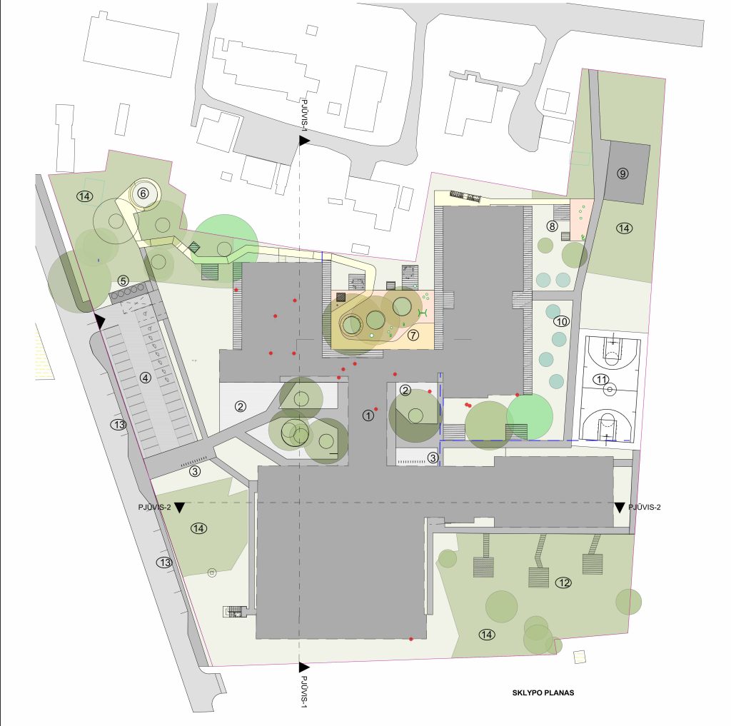 Idėjos koncepcija – mažas edukacijų, žaidimų ir poilsio miestelis. Skirtingų dydžių korpusai, žali kiemeliai, miško fragmentai – tai „GAMA“ ir „skambesys“ spalvų, tūrių, erdvių ir gamtos. Pagrindinę pastato idėją suformavo urbanistinis ir gamtinis kontekstas. Siekiant pratęsti esamo užstatymo viziją ir išsaugoti medžius, buvo pasirinkta projektuoti smulkesnių tūrių pastatą, kuriant kiemų tinklą ir poilsio, žaidimo, mokymo erdves medžių pavėsyje. Pastato „dviguba“ paskirtis įtakojo pastato funkcinius sprendinius. Pastatas projektuojamas iš kelių korpusų, sujungtų bendro naudojimo erdvėmis. Centrinėje sklypo dalyje projektuojama pastato šerdis – pagrindiniai įėjimai į pastatą. Vakarinėje pusėje projektuojamas darželio korpusas, o rytinėje pusėje – pradinės mokyklos korpusas.
