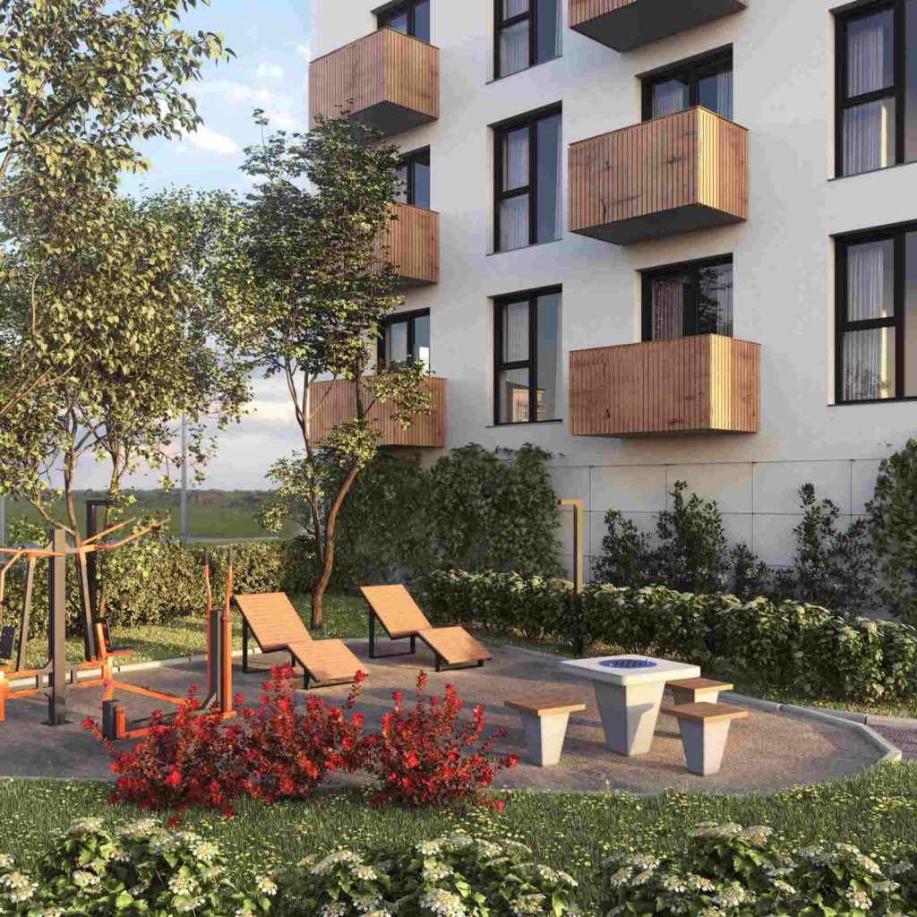 Trijų korpusų daugiabutis gyvenamasis pastatas pratęsia esamo kvartalo vystymąsi. Nestandartinės trikampės konfigūracijos sklypas nulėmė suprojektuoti pastatą, kurį sudarys trys minimalistiniai tūriai. Trijų korpusų kombinacija kuria jaukią ir vizualiai dinamišką aplinką. Tarp pastatų numatomi mažosios architektūros elementai, vaikų žaidimų aikštelės, jaunimo ir senjorų poilsio zonos. Sklypo centrinė dalis skirta poilsiui ir gyventojų rekreacijai. Dėl to visas parkavimas numatomas tik požeminėje dalyje, o kiemo dalis skirta apželdinimui, takeliams. Pastatų apdailai naudojamas – tinkas, klinkerio plytelės, betonas, įvairūs metaliniai, medieną imituojantys elementai – tvarios ir derančios prie vietinio konteksto medžiagos.