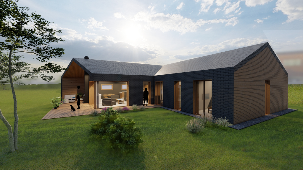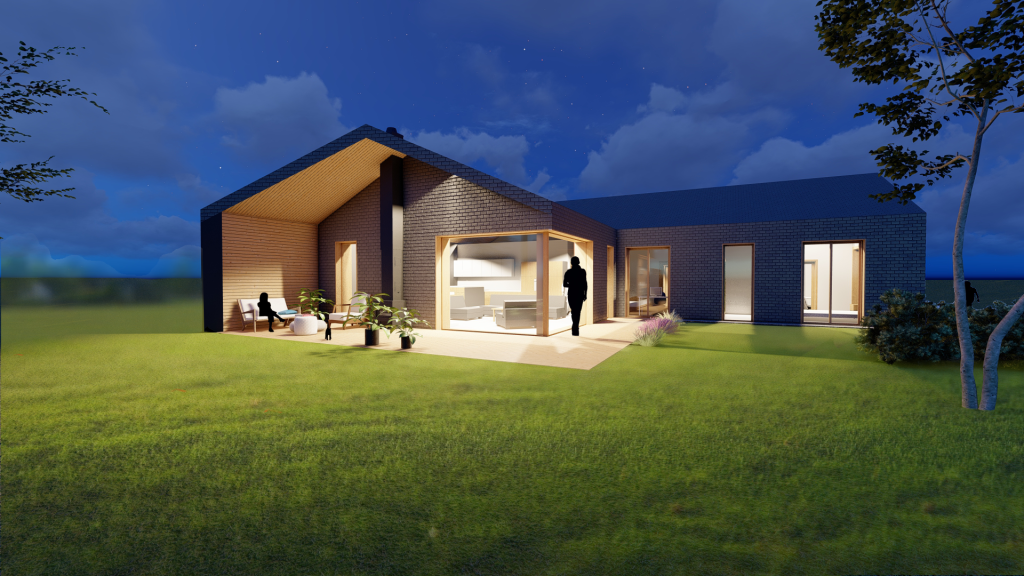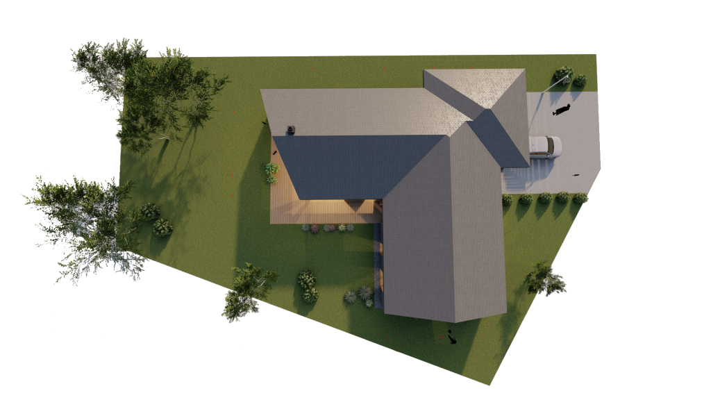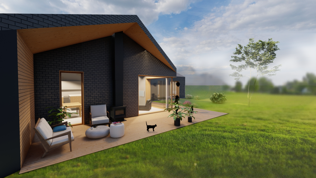 Šis vieno aukšto, dviejų „sparnų“ gyvenamasis namas su šlaitiniu stogu pasižymi lakoniškomis formomis ir moderniomis medžiagomis, kurios suteikia šiuolaikinį vaizdą. Rytinėje pastato dalyje projektuojamas įėjimas, iš kurio patenkama į dvi funkcines zonas. Pietiniame „ramiajame sparne“ įrengti: vaikų kambariai, miegamasis, sanitariniai mazgai bei pagalbinės patalpos. Vakariniame „aktyviajame sparne“ suprojektuota: svetainė, virtuvė, sanitarinis mazgas ir techninė patalpa. Abi zonos turi tiesioginį išėjimą į terasą ir vidinį kiemą, kuris kuria privačią ir jaukią erdvę šeimos poilsiui ir laisvalaikiui.